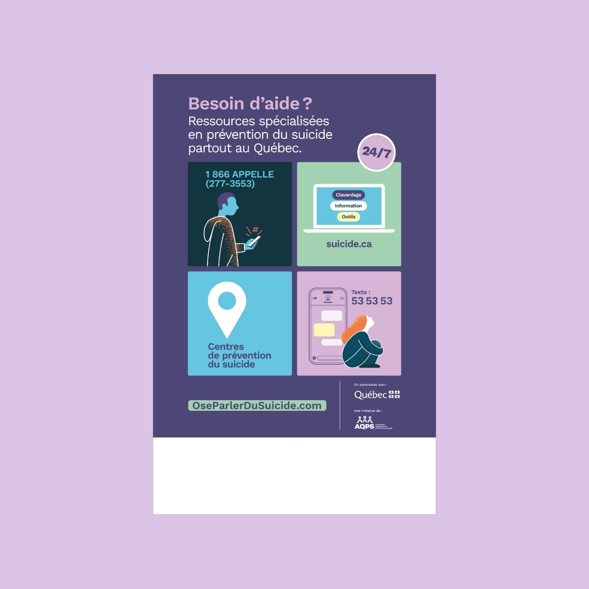 Ce matériel de sensibilisation s’inscrit dans la campagne de la Semaine de prévention du suicide de l’AQPS. Pour en savoir plus, visitez le site oseparlerdusuicide.com.