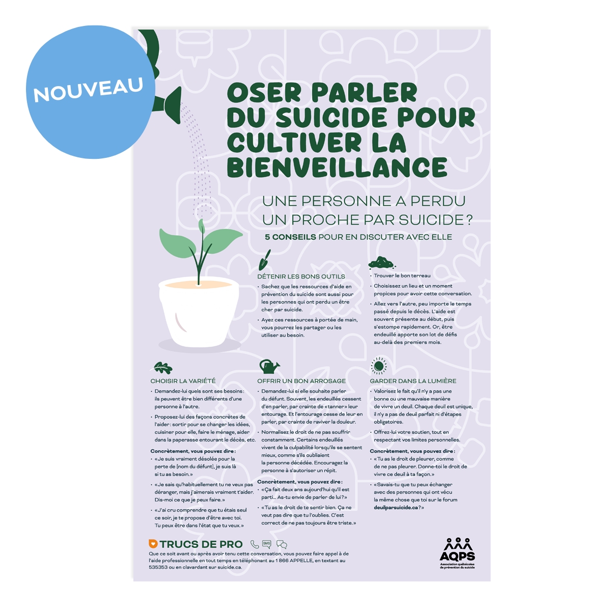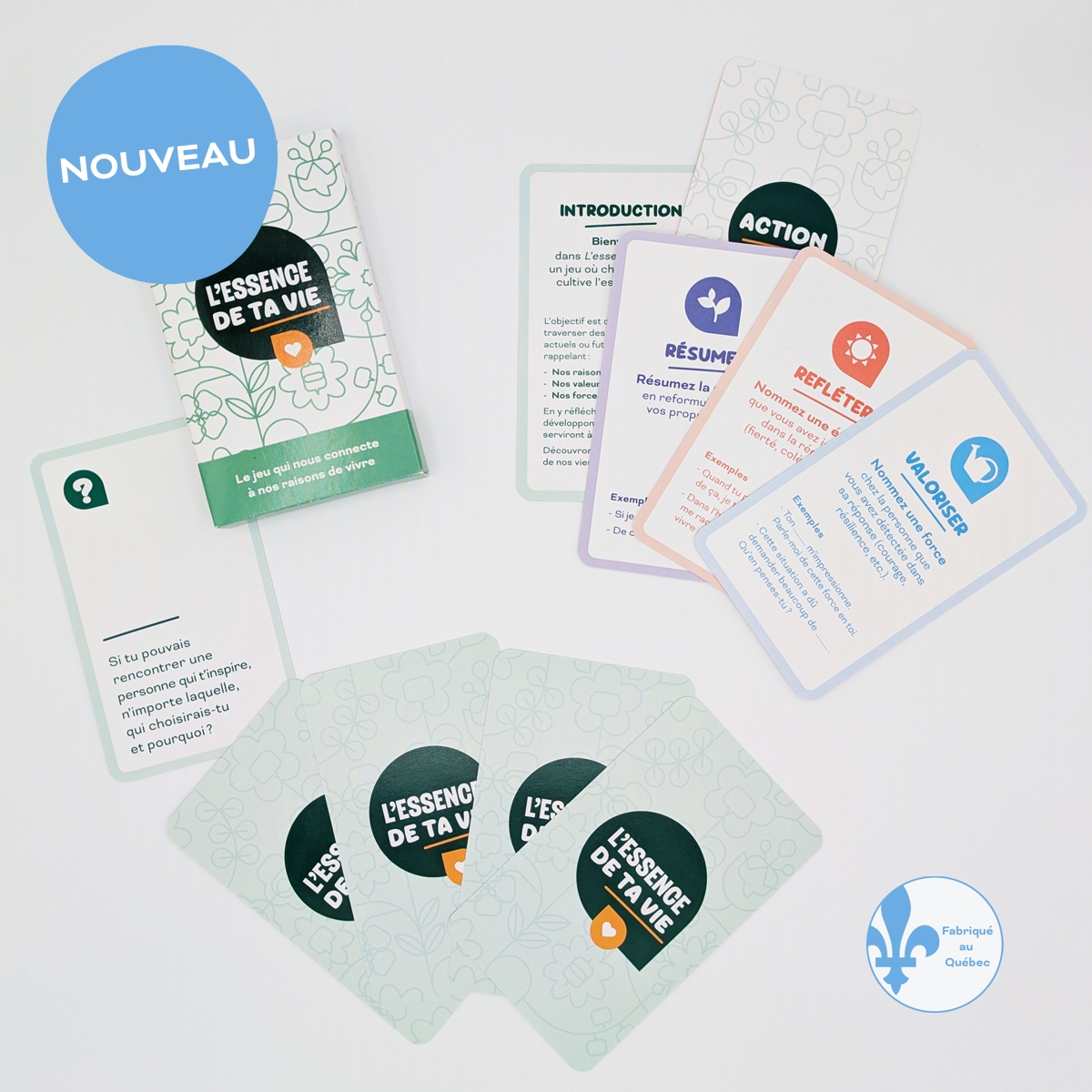 Conçu par des spécialistes en prévention du suicide, ce jeu propose 45 questions pour raviver l’espoir, renforcer la résilience et reconnecter les membres de votre milieu à ses forces, valeurs, ressources et raisons de vivre. Organisez une activité de sensibilisation en prévention du suicide dans votre milieu de travail, d’intervention ou d’appartenance grâce à ce jeu basé sur l’approche orientée vers les solutions (AOS).